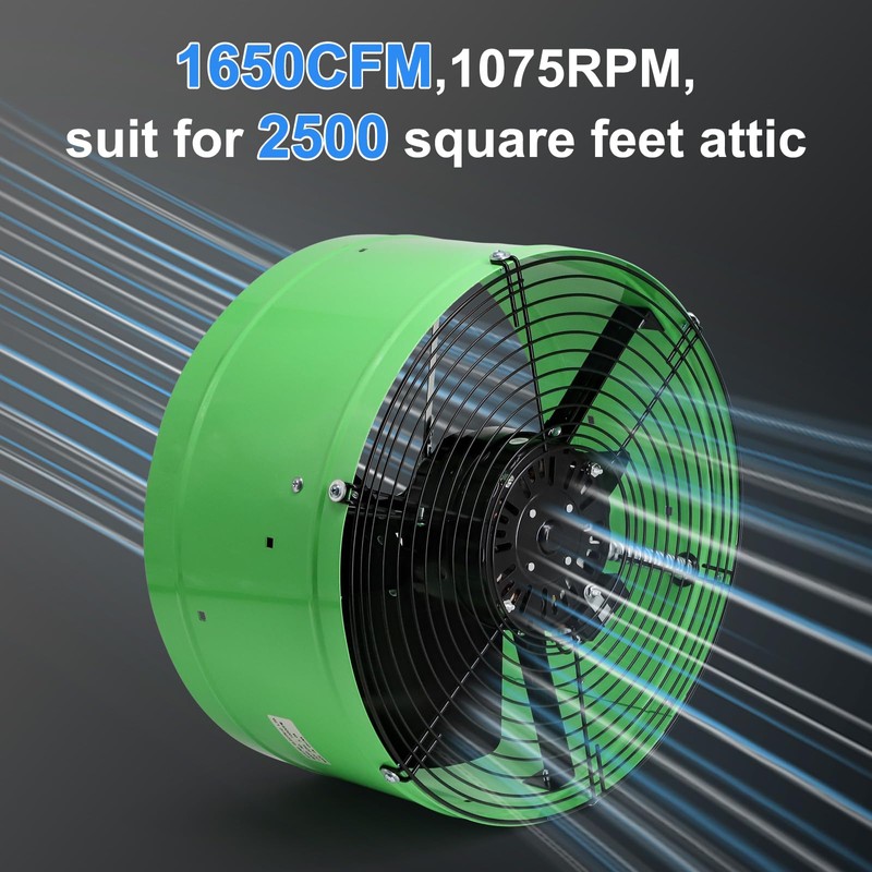 - High Ventilation Efficiency:1650 CFM gable attic fan designed specifically for residential attic spaces with ventilation areas up to 2500 square feet,1075RPM high rotational speed motor,heavy-duty motor keeps your attic cooler, good exhaust performance,effective removal of heat, reduces air conditioning costs and rapid air circulation