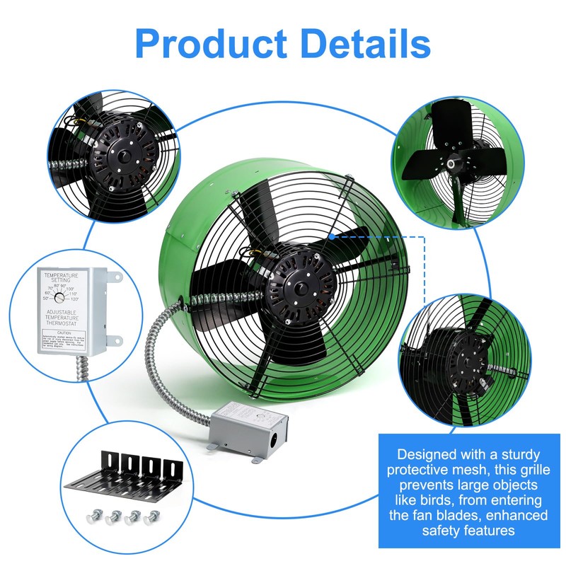 - Attic Fan with Thermostat:This exhaust ventilation fan comes with a thermostat, the thermostat turns on when the temperature rises and turns off when it drops, it is more convenient and no need human intervention,saving energy,promote environmental protection and green life