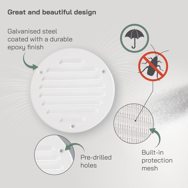 • Square ventilation grille, made of high quality galvanised steel and coated with a durable epoxy finish. No screws included.