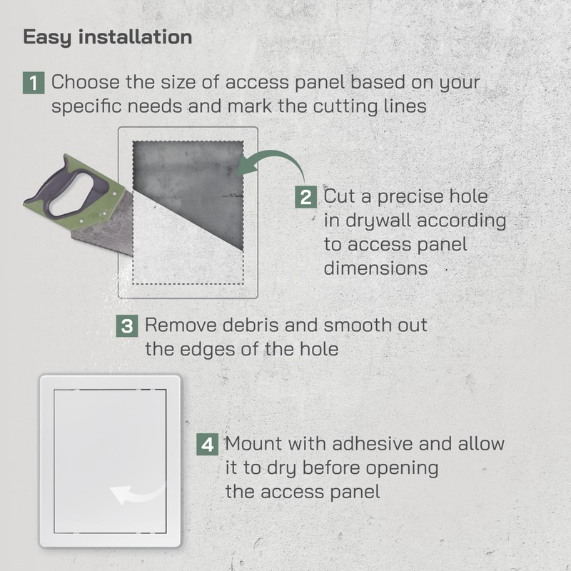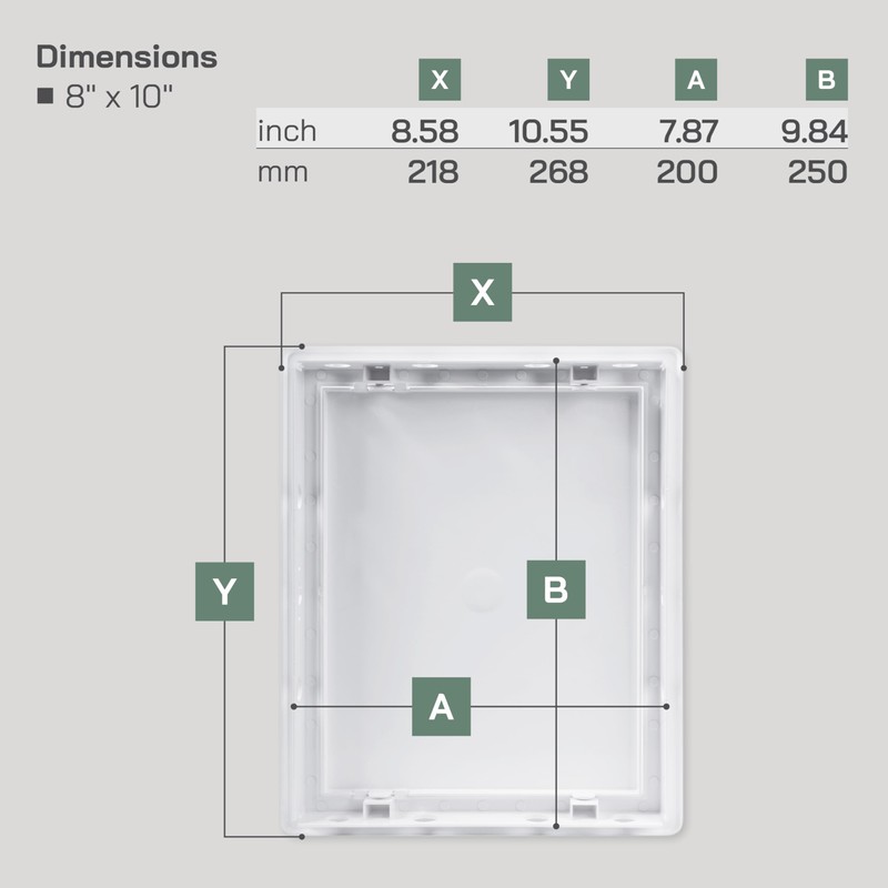 - Easy to install wall panel. Convenient DIY job. Access panel can be surface mounted. Outer panel dimensions: 8.6 x 10.5 Inches / 218 x 268 mm. For additional dimensions, please see images.