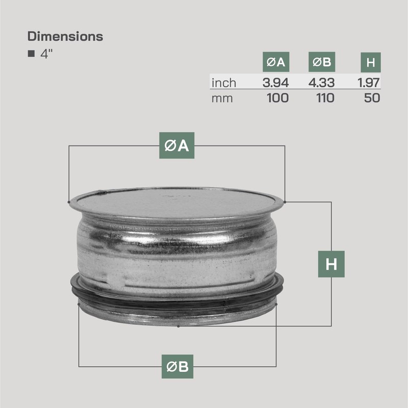 - End cap is made to fit standard 4" Inch ducts. Diameter: 3.93" Inches. Flange depth: 1.96" Inches. Material: Galvanized steel, C2 class corrosion resistance.