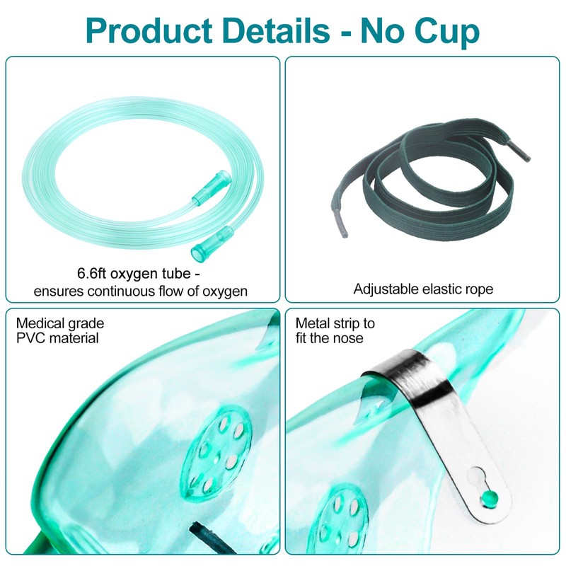 - No Cup (Oxygen Mask): Consist of 2 masks made of PVC and 2 tubing. Without cup, only connected to an oxygen machine or tank.