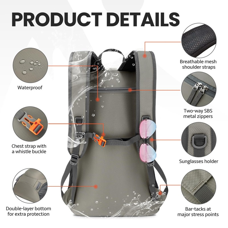 • 【Compact & Comfortable】It weighs only 0.7 pounds, can easily fold into its own pocket for storage,and unfold it when you need it. Breathable mesh shoulder straps with plentiful sponge padding help relieve the stress from your shoulder. The chest clip with a whistle buckle work perfectly to distribute the pack’s weight and keep it steady and centered. A must have for sports , hiking, camping and traveling.