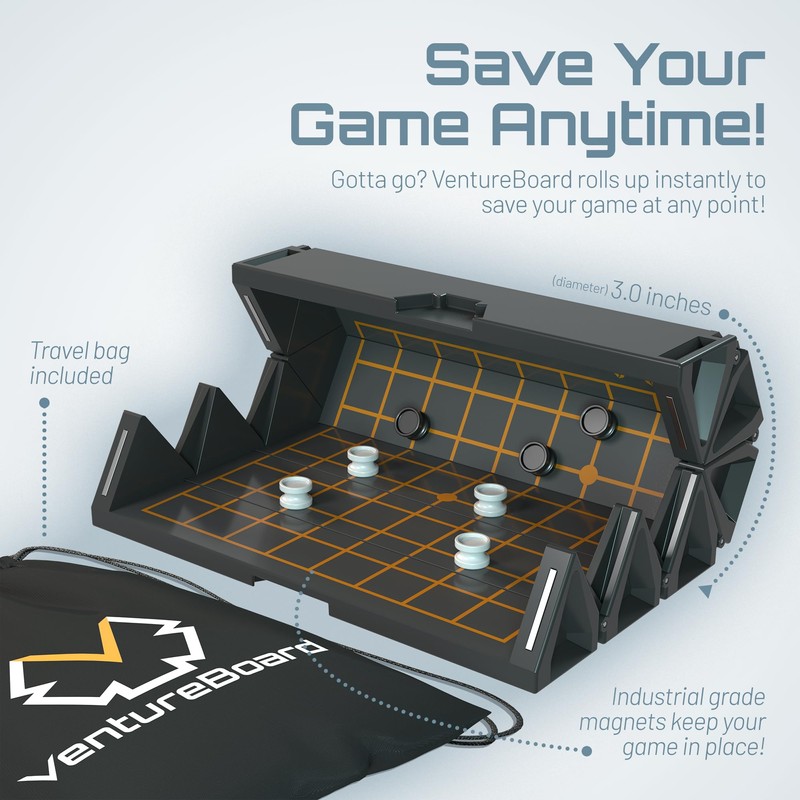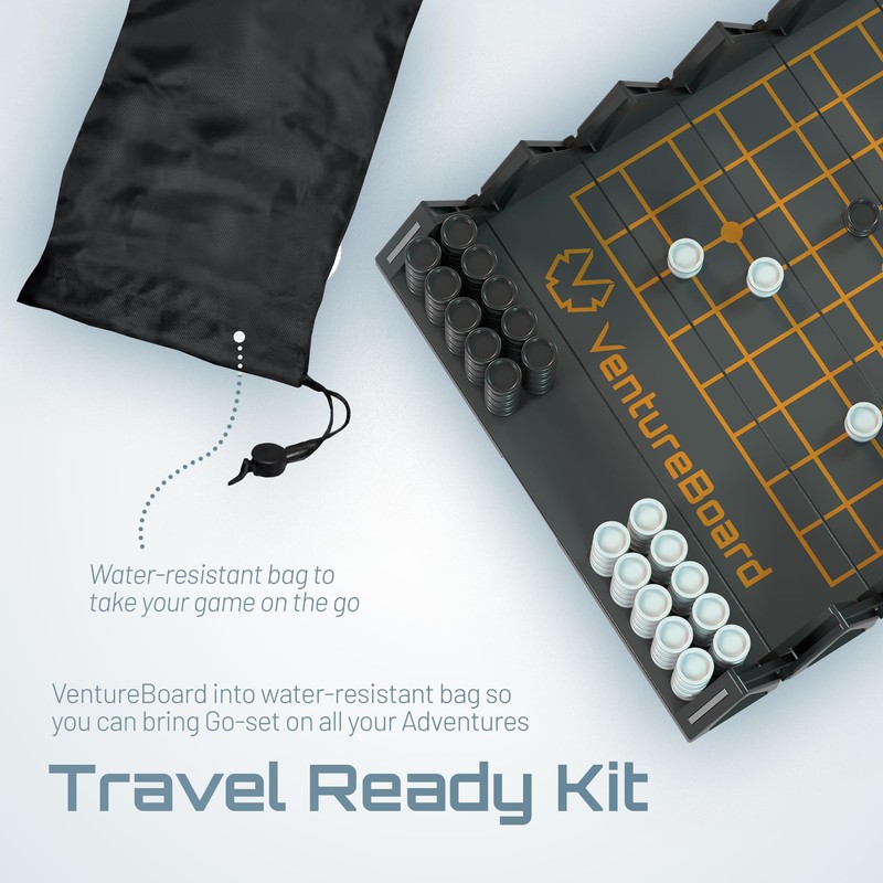 - Premium Quality - A marvel of engineering, VentureBoard’s panels interlock on six different planes when rolled up making this the sturdiest Go board on the market. It includes 16 Pieces, 3 dice, a Water-Resistant Bag.
