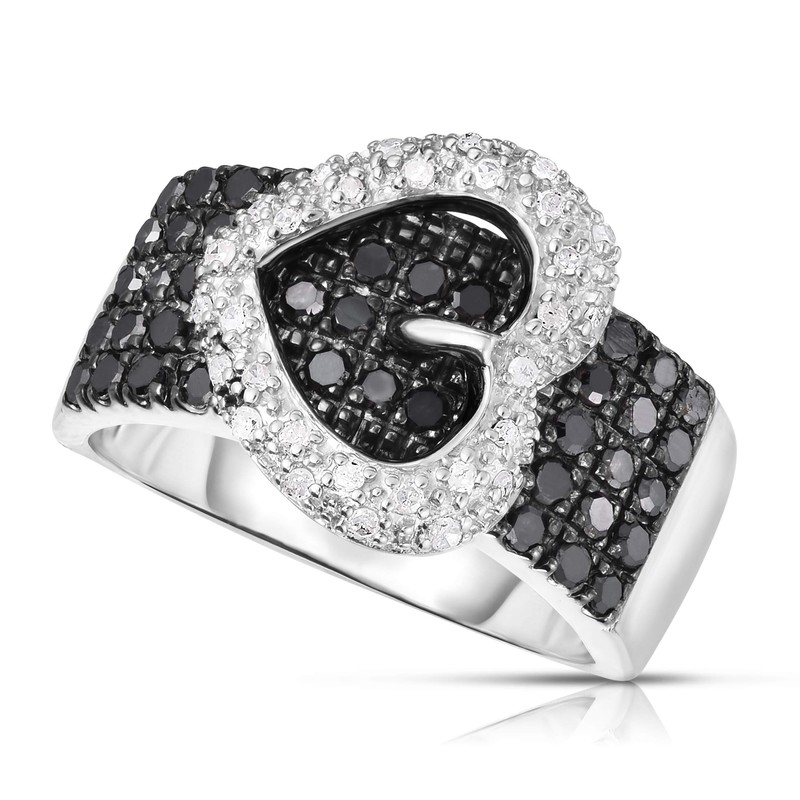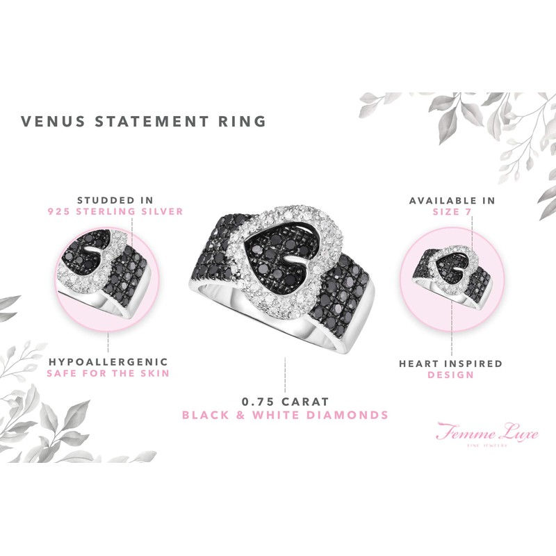 Venus Statement Ring - 0.75 Carat Black & White Diamonds Buckle Ring 925 Sterling Silver, Size 7, Hypoallergenic