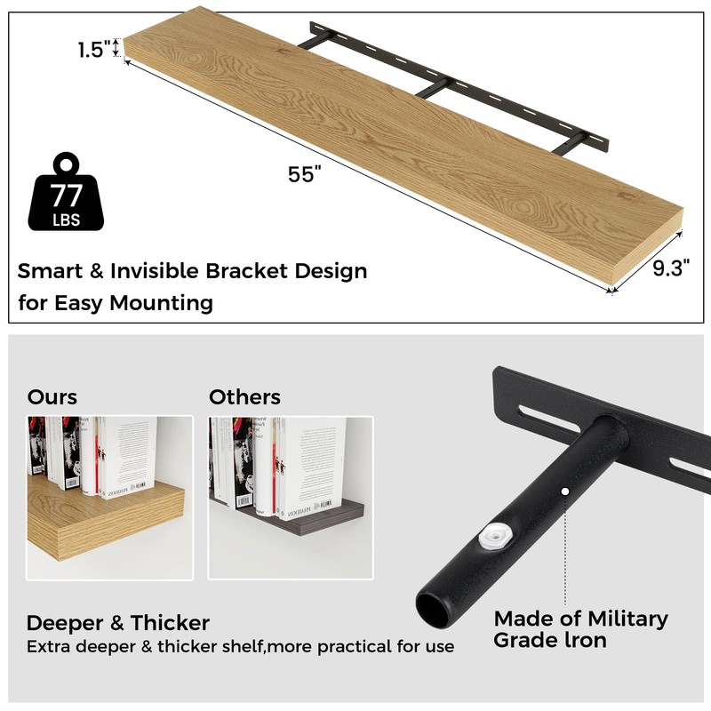 - STURDY SUPPORT: Make the most of your wall space with our 55x9 inch oak deep floating shelves. At 1.5 inches thick, they offer sturdy support for your books, plants, and decorative pieces. Each shelf can hold up to 77 lbs, ensuring your items never sag or fall.