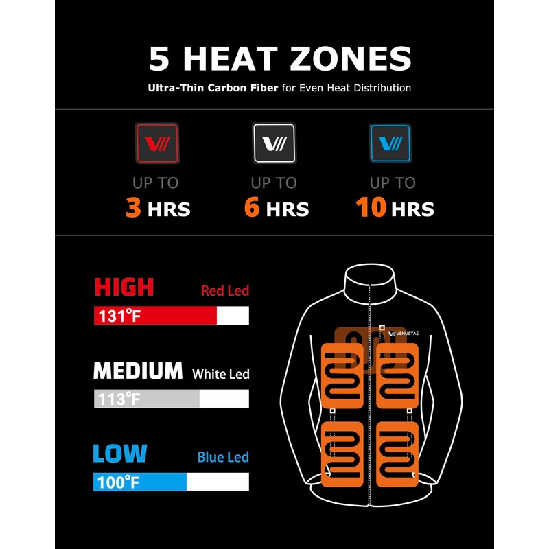 - 5 Heating Zones: Venustas men's heated jacket is designed with 5 carbon fiber heating elements strategically placed on the chest, pockets, and back, ensuring core body warmth. With three temperature settings (high/medium/low), easily adjusted with the press of a button, it can keep you warm for up to 8 hours on the low setting.