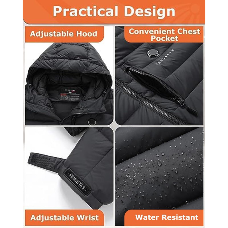 - OUTDOORS VERSATILITY: Venustas heating puffer coat for men is designed for the elements with 4 zippered pockets、stand-collar, adjustable hood and wrist that round out the protection. The nylon shell is windproof and water repellent for outdoor needs, suitable for climbing, hunting, hiking, camping, motorcycle.