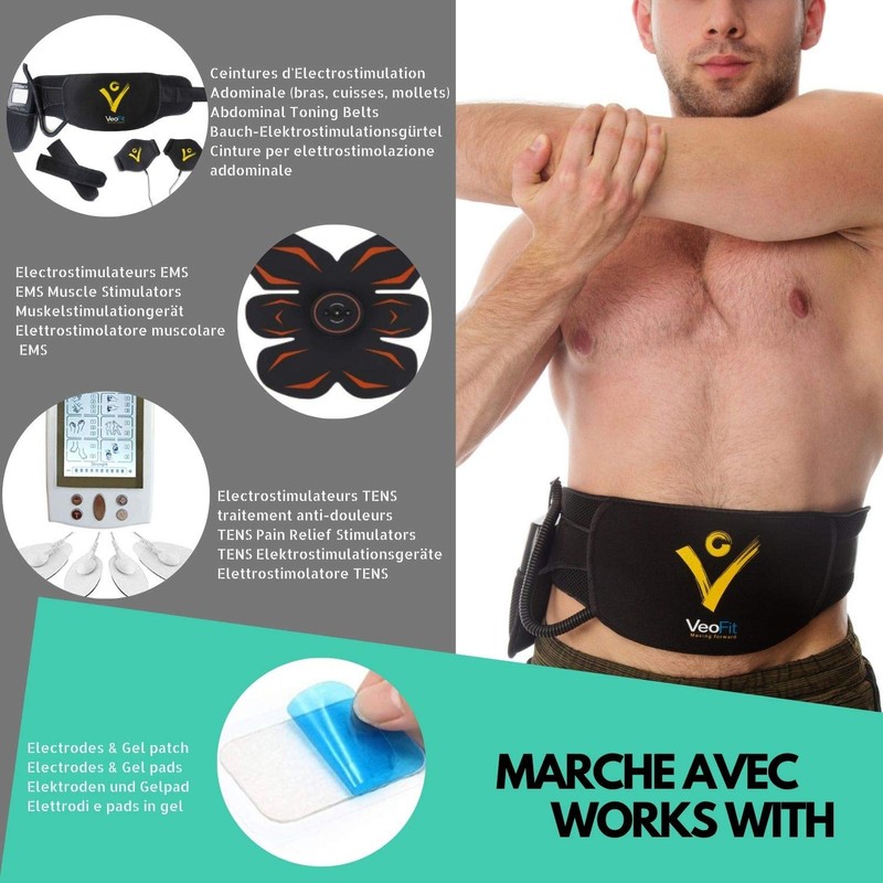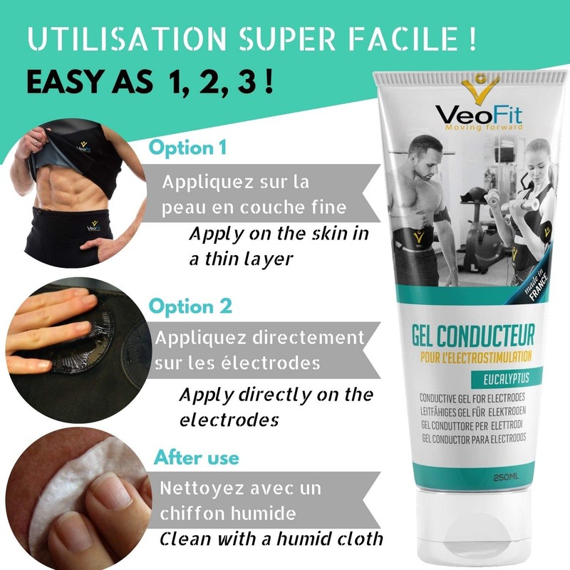 - Few drops are enough to improve the conductivity of the electrodes, optimise their adhesion to the skin and extend their service life. The VEOFIT electrode gel for muscle stimulation works with all EMS fitness belts, EMS devices, TENS devices, stimulation current devices, electrostimulators, single electrodes, electrode pads.