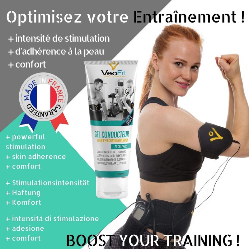- Optimise your strength training with the Veofit contact gel. It is specially designed to improve the transfer of electrostimulation to the skin and make your workout more effective. Your muscles are stimulated more intensively and evenly to achieve an optimal result.