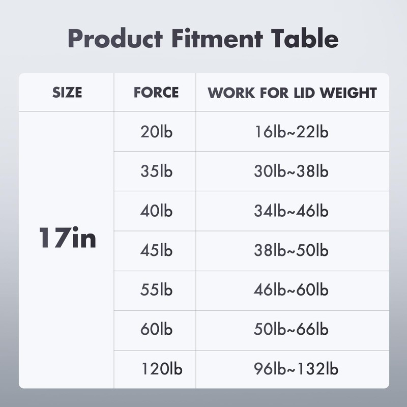 • 【Specification】 17 inch 20 Lb Gas Shock Extended Length (Center-to-Center): 17.13in (435mm); Compressed Length (Center-to-Center): 11.22in (285mm); Force: 20 lbs (89N); End Fiting: 10mm Ball Stud Sockets. 2 Struts per set