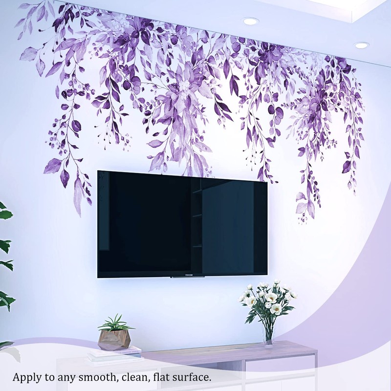 VePret Purple Plants Leaves Wall Decals Peel and Stick, Large Floral Flowers Wall Stickers, Removable Vine Home Decor Art for Bedroom Living Room Classroom Office