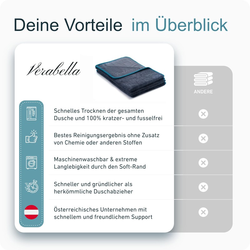 Verabella Dry Towel Shower - The Original - Shiny Towels 60 x 40 cm, Shower Cubicle Cloth Made of Soft Microfibre Against Water Stains in the Shower and Bathroom - Fast Dry Wipes for Bath (Pack of 2)