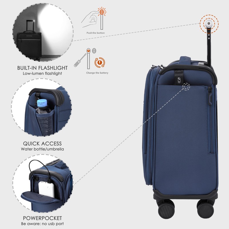- THOUGHTFUL DESIGN: Built-in flashlight on handle, If you are holding your luggage in the parking lot or looking for your vehicle in the dark, you can press the flashlight button twice to get a better look at the road ahead. Press button once to remind other vehicles of someone in front. So that you can reach your destination more safely.