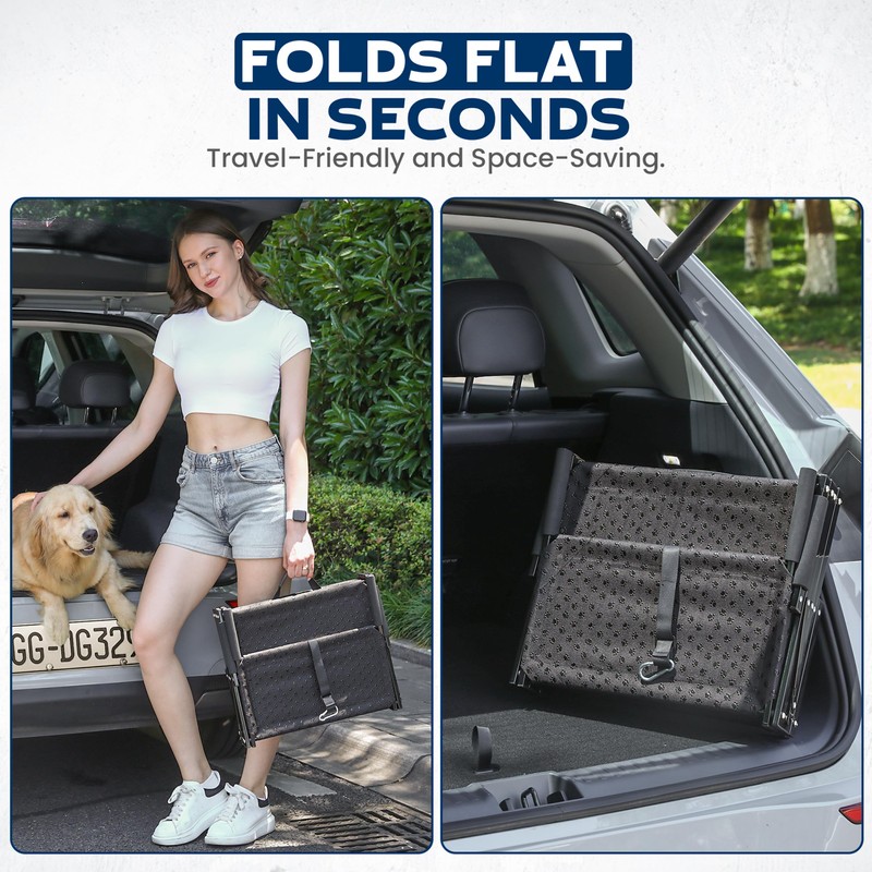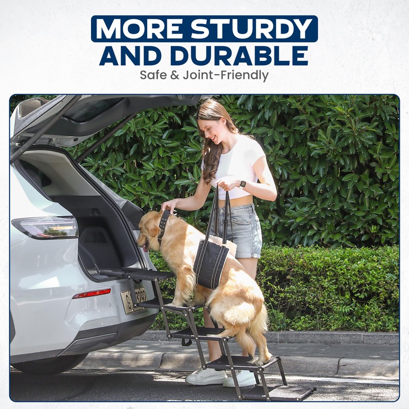- 【Folds Flat in Seconds】 Weighing just 9.5 lbs, the stairs fold flat for compact trunk storage. A padded handle makes carrying easy, and the adjustable height (17”–28”) fits a wide range of vehicles.