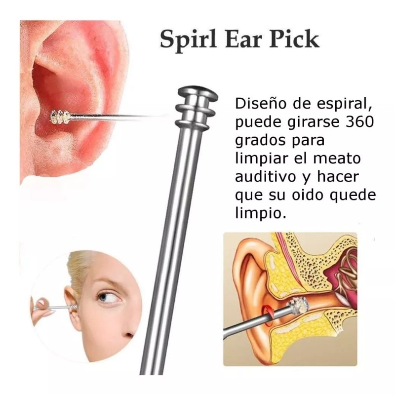 Herramienta de limpieza con un diseño único en espiral que le permite dar masajes al canal auditivo y aliviar la picazón mientras limpia.