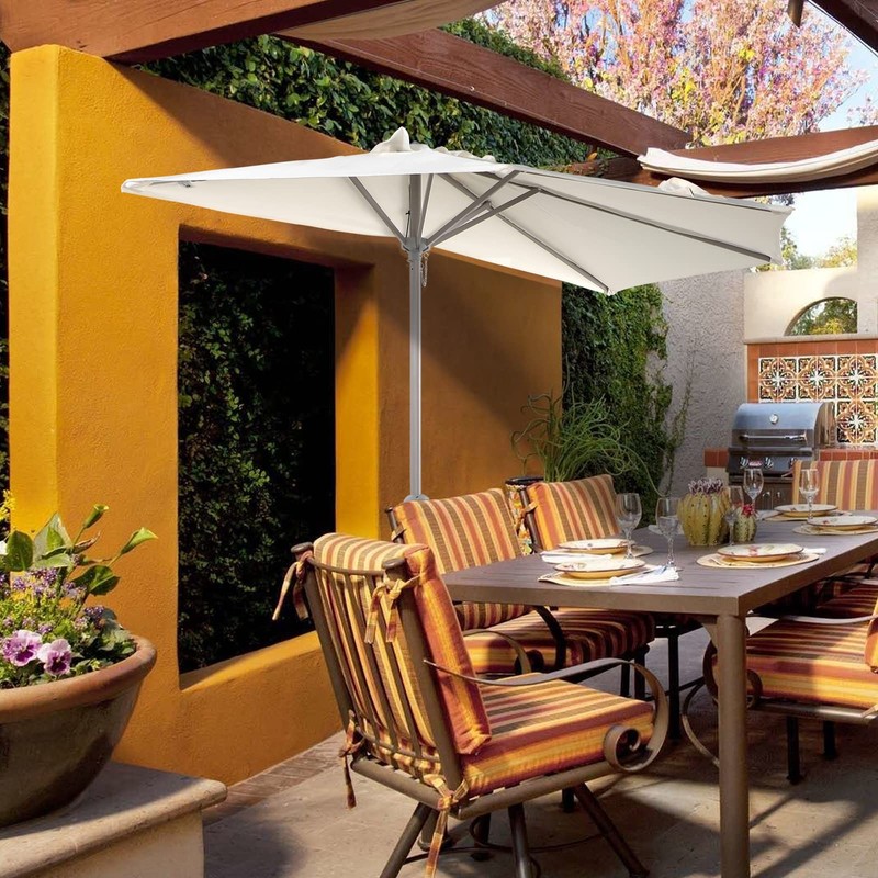 - 【Unique Design】 The half round designed umbrella with one flush side brings a unique appearance to fit the space, perfect for tight spaces that need shade, and can be pushed flush up against a wall or glass door locations.