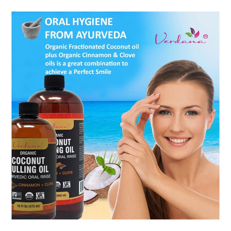 Verdana Verdana Organic Coconut Pulling Oil – Big 16 Fl Oz Size – Cinnamon + Clove - Ayurvedic Oral Rinse – USDA Organic, Kosher Non-GMO - Alcohol & Floride Free for Fresh Breath, Healthy Teeth