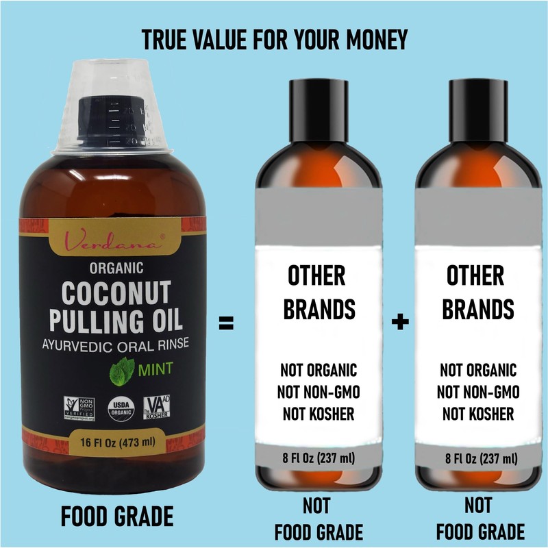 • 16 OZ PULLING OIL FOR YOUR MONEY: A full month’s worth of High Quality Premium USDA Certified Organic Food Grade Coconut Pulling Oil in Cinnamon + Clove Flavor for you. Our Verdana Pulling Oil contains Food Grade Organic Fractionated Coconut Oil blended with Food Grade Organic Cinnamon & Clove Oils in a Food Safety Certified Facility in our own United States. Don’t settle for the tiny 8 oz size offered by others.