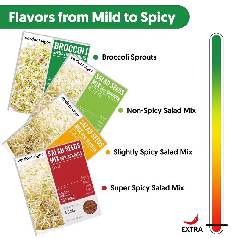 - Flavors from Mild to Spicy: Verdant Vigor designs a series of sprouts with different flavors from mild to hot. There are broccoli sprouts, non-spicy salad mix, slightly spicy salad mix, and super spicy salad mix. Whether you prefer salads, sandwiches, bowls, stir-fry, dishes, or snacks, you can eat sprouts in 5 days with Verdant Vigor seeds