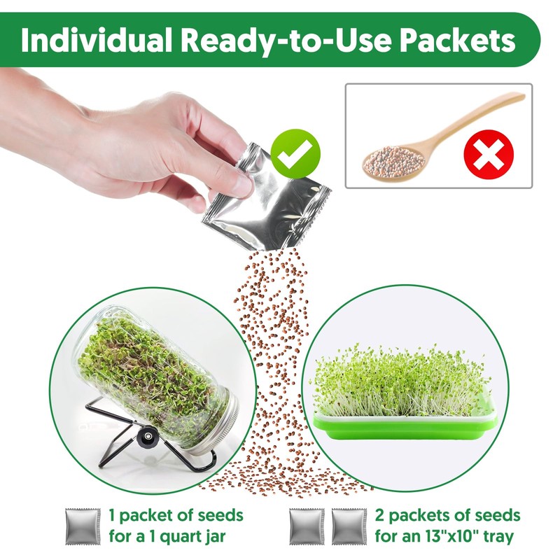 - Packed for Easy Sprouting: 10 individual ready-to-use packets inside, each packet of seeds is premixed for sprouting. 1 packet of seeds is just enough for a 1 quart jar or 2 packets for a 13"x10" tray. Getting you free from measuring and mixing seeds. Equal seeds mix ensures the same taste for each packet