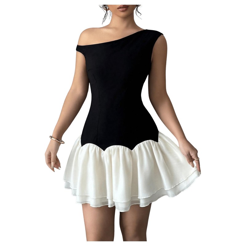 - One shoulder mini dress, ruffle hem, contrast mesh dress, drop waist, a line dress, zipper up, bodycon dress, layered fairy dress