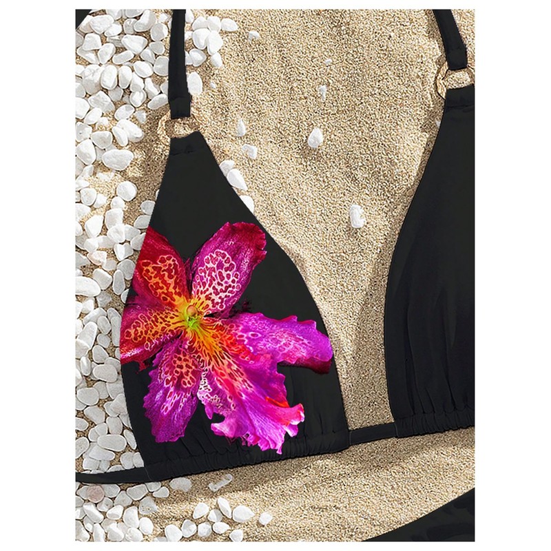 Verdusa Women's Floral Print Halter Bikini Top String Triangle Bra Swimsuit Tops Black Flower Medium