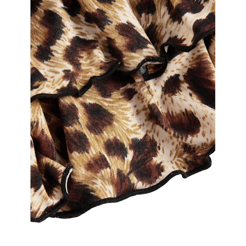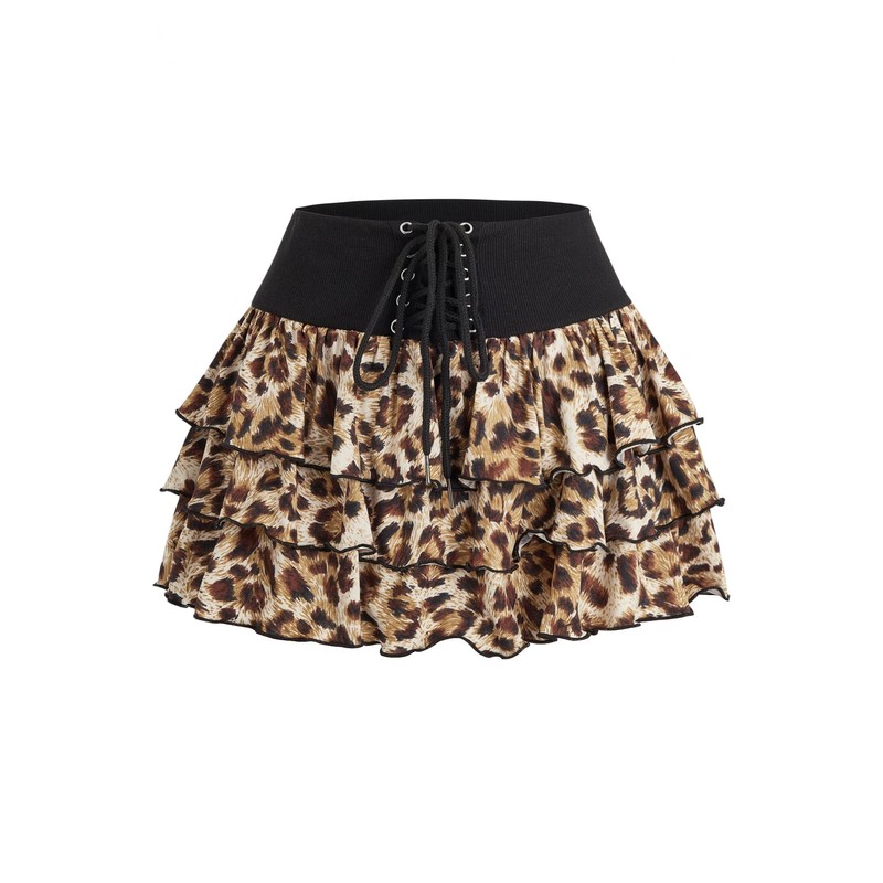 Verdusa Women's Leopard Print Tiered Layered Ruffle Mini Skirt Lace Up Tie Front Short Skirts Brown Small
