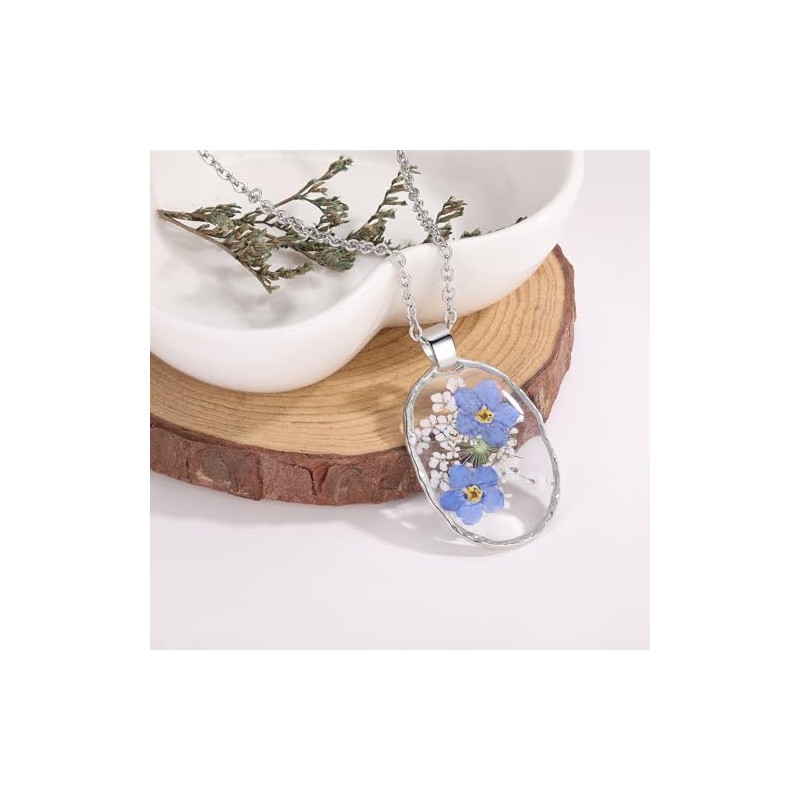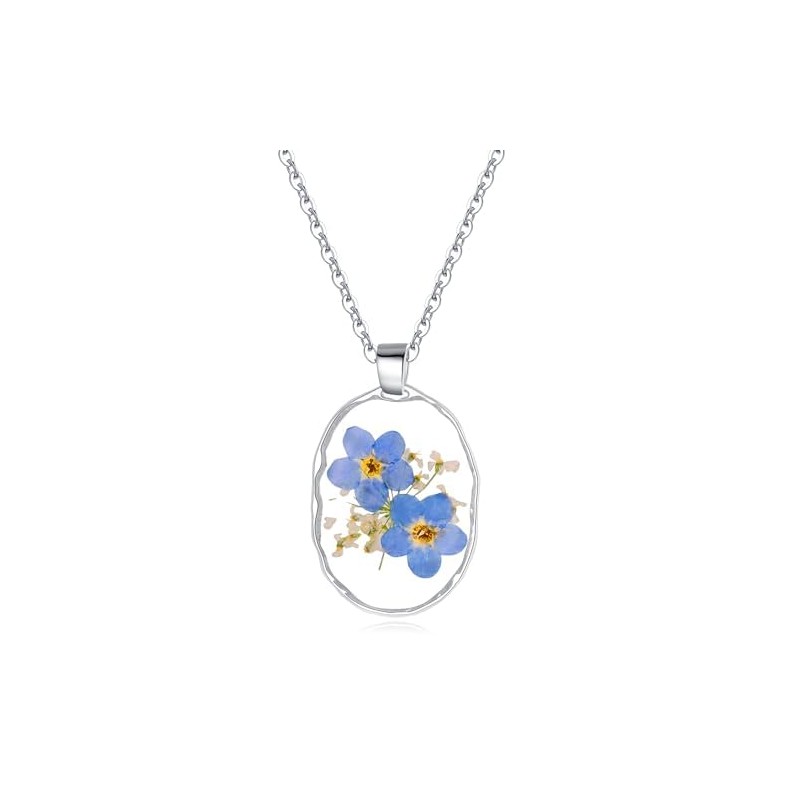 Vergiss-mich-nicht oval Anhänger gepresst Blume Halskette | Vergiss-mich-nicht Schmuck | Vergiss-mich-nicht Halskette | Personalisierte handgefertigte Halsketten für Frauen | 45cm