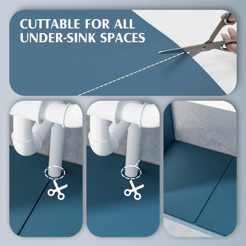 - Adjustable Size & Multi Purpose:The under sink mat can be trimmed with scissors which make it can apply to various size easily. Besides the practical under sink mat can be applied to bathroom cabinets and beneath washroom counters. It can also be used as a pet feeding mat, dish rack mat, becoming a good helper in your life.