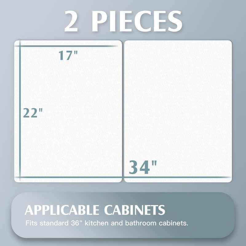 - Two-piece Design Fits More:34"x22" undersink mat for bottom of kitchen sink is designed for standard 36" kitchen and bathroom cabinets. The double-piece design of the under kitchen sink mat can be applied to under-sink environments with different plumbing designs, so you won't have to worry about it anymore.