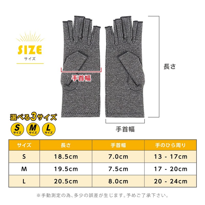 - <程よい着圧力> 伸縮性のある生地が程よい着圧力を生み出し手・指を包み込み痛みを軽減します。