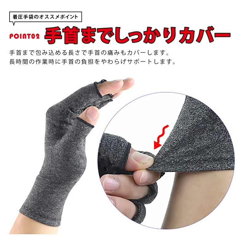 - <程よい着圧力> 伸縮性のある生地が程よい着圧力を生み出し手・指を包み込み痛みを軽減します。