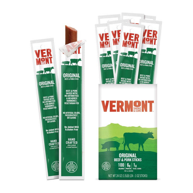 Snack Sticks by Vermont Smoke & Cure – Original Flavor – Beef & Pork – Healthy Meat Protein – 1oz Jerky Stick – 24 count carton