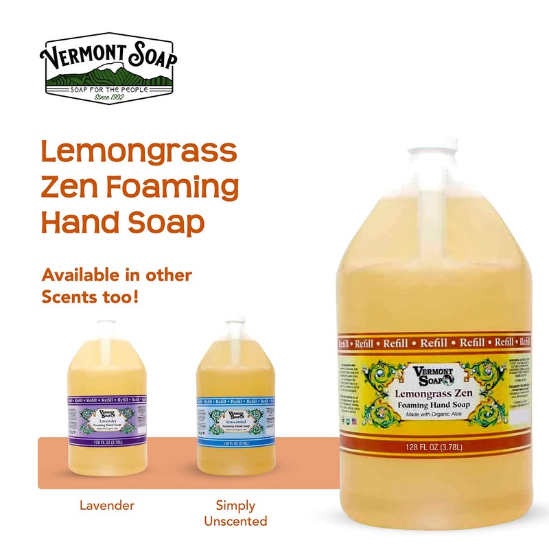 VERMONT SOAP Organics Foaming Hand Soap, Liquid Soap with Pre-diluted Formula - Ready to Use Lemongrass Hand Soap With Convenient and Economical Gallon Refill Size