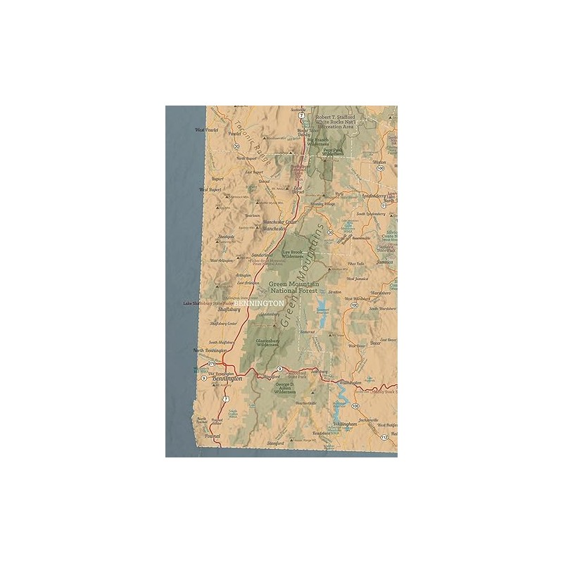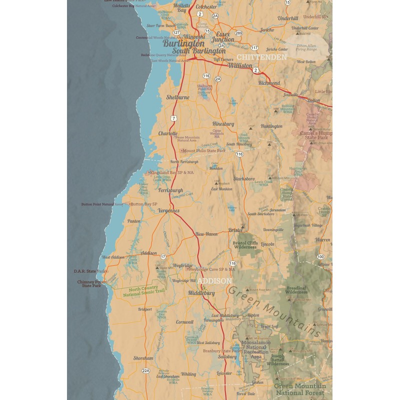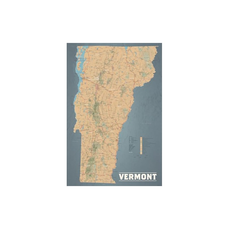 - Large, decorative poster of Vermont featuring brilliant colors, a unique styling, and extensive detail