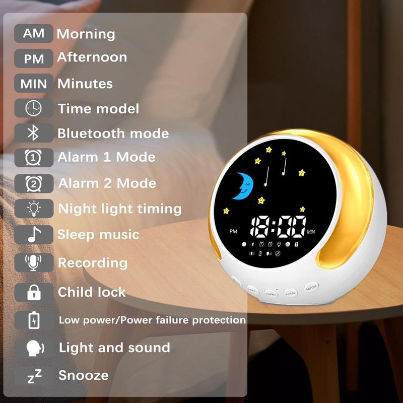 Younger children can not fully understand the concept of time,we design this clock to teach your children when its fine to go to sleep and wake up! it comes with all the features necessary to help your kids sleep better and wake-up refreshed! It's a sleep trainer, alarm clock, sleep sounds machine, night light and sleep timer rolled into one package