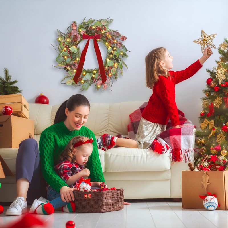 • VERSATILE DESIGN: 24-inch artificial Christmas wreath with burgundy bow, eucalyptus, red sprays, black berries, and realistic pine needles for indoor holiday decor