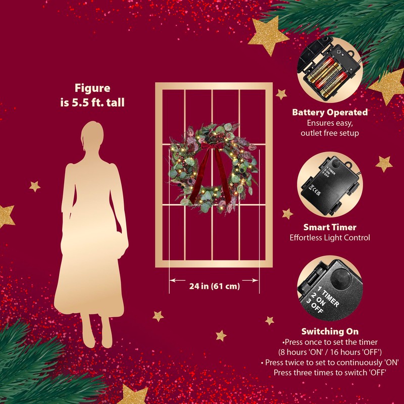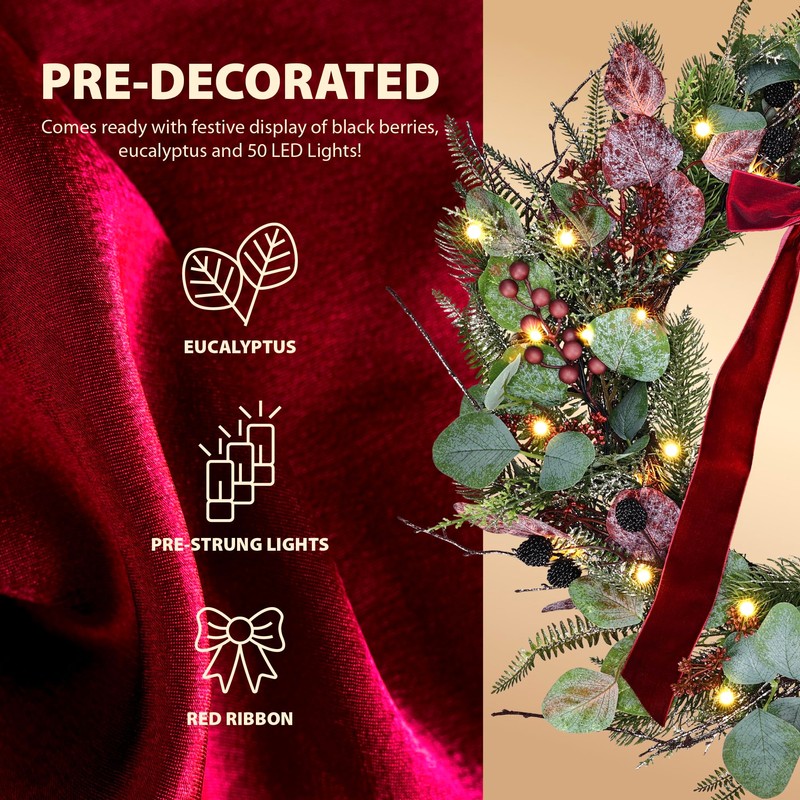 VERT NOOK VERT NOOK Artificial Christmas Wreath, 24 inch Pre-lit with 50 LED Lights, Burgundy Bow, Eucalyptus, Red Sprays, Black Berries