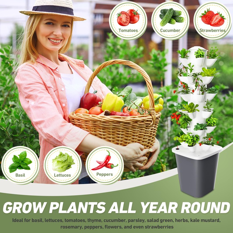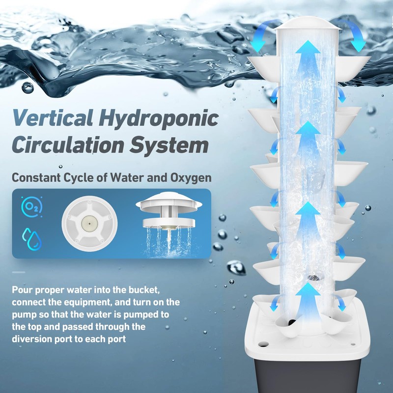 • Complete Accessories and Simple Setup: Kit includes a 6-story-5-hole tower(total 30-plant sites), 1 × water pump, 1 × water tank, 100 cultivating sponges, 1 × foldable funnel, 1 × water level indicator, 1 × power adapter, very quick and easy to set up with manual. Note: Seeds and plant food not included