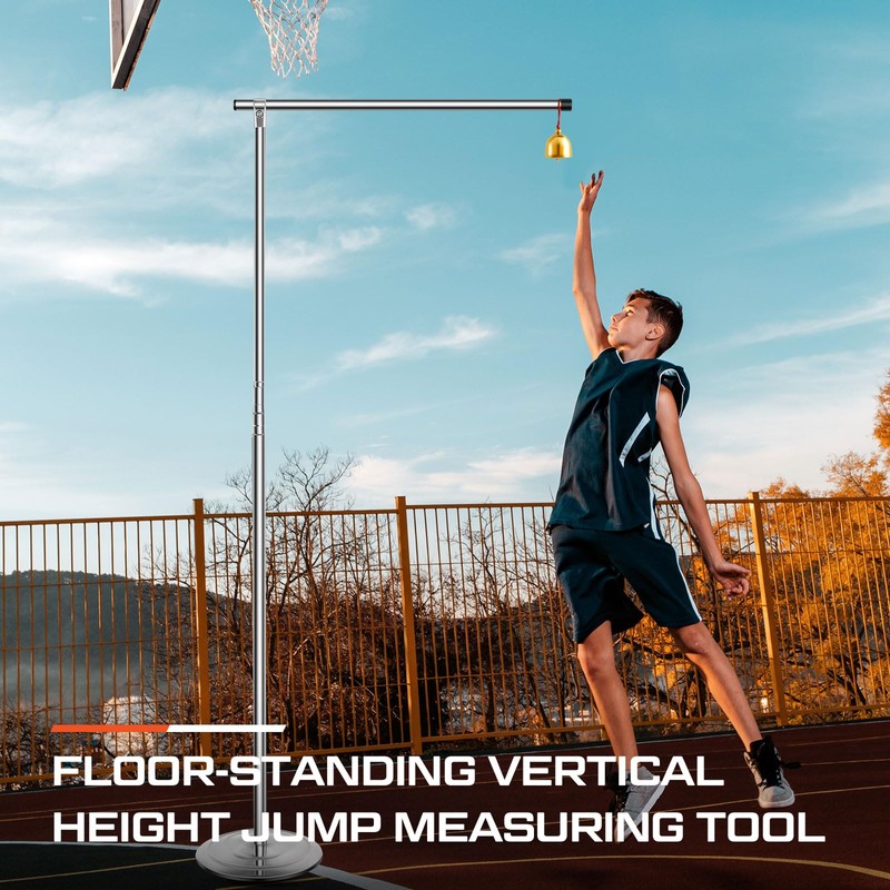 - The vertical jump measuring device has a total of three telescopic rods, only No; 2 rod can be scaled with 60 cm/23.6 in; The minimum height can be adjusted to 1.08 m/3.54 ft, and the maximum can be adjusted to 3.49 m/11.45 ft (all calculated based on the height of the lowest point of the bell from the ground)
