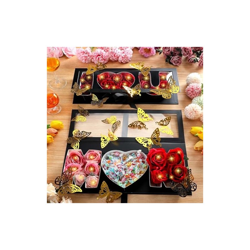 - Versatile Package: you will receive 2 set of blue MOM gift boxes for flower and 24 gold butterfly decorations in 2 different kinds; Our letter shaped gift box also comprises battery cases and two light strips, each featuring 10 LED lights, to create a warm and inviting ambiance within the gift box