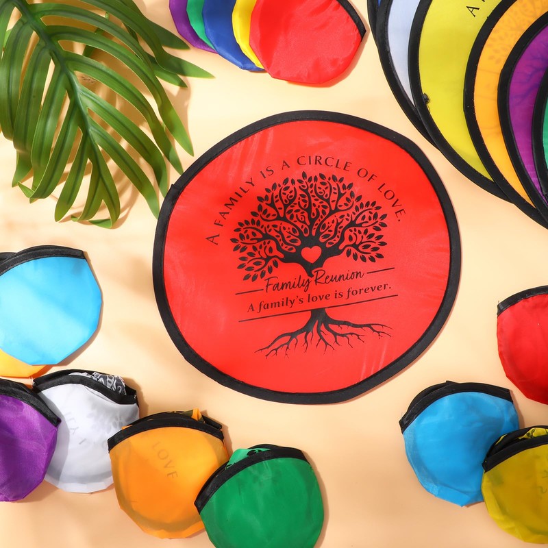 Features:Memorable family reunion themes:Our foldable flying disc fans have been specially designed with the theme of family reunions. Printed with the phrase [A family's love is forever], they symbolize deep familial connections making them perfect gifts for family reunions, enhancing their emotional and sentimental value.Unforgettable family moments:This foldable flying disc with bag is suitable as a small gift for family gatherings. It deepens the emotional connection between family members and is ideal for various commemorative events, like important family birthdays, wedding anniversaries or traditional festivals.Specifications:Material: polyester, foldable steel wiresColor: red, orange, yellow, green, blue, purple, white and navy blueUnfolded size: approximately 9.84 inches in diameterFolded size: about 3.74 inchesPackage includes:16 Sets foldable flying disc fans with bagNotes:Manual measurement, please allow slight errors on size.The color may exist a slight difference due to different screen displays.