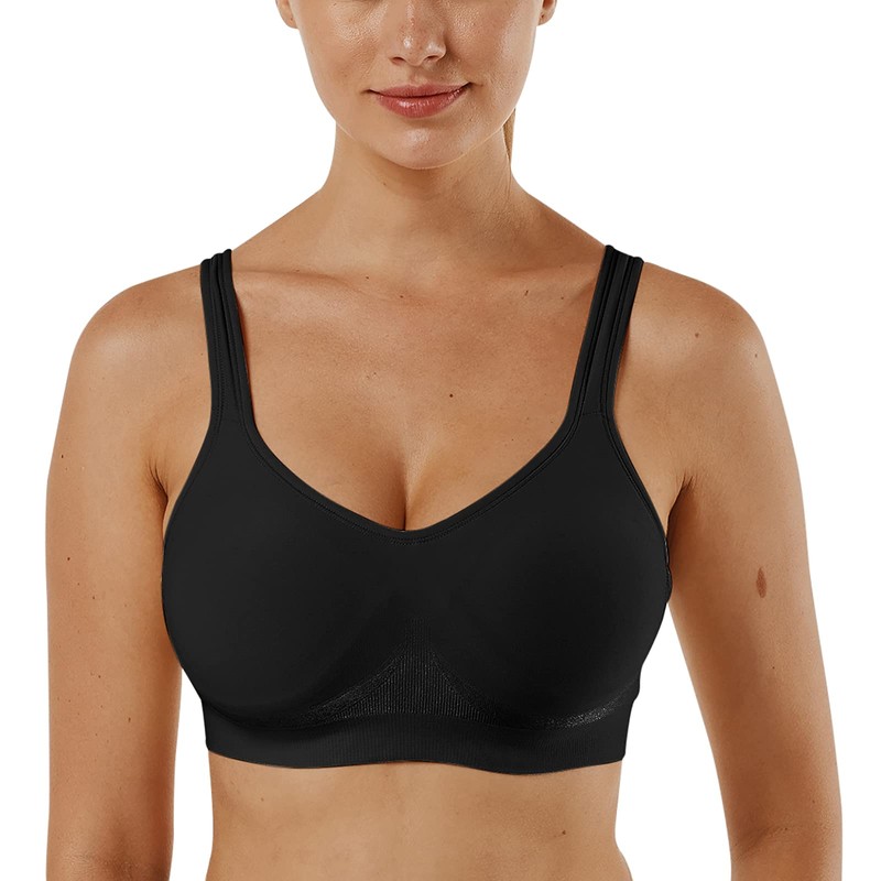 - 【High Elasticity】High Elastic wide shoulder strap can reduce the shock and vibration during the low impact exercise, our wirefree bra provides good support. Wide hem fits tightly to your body and is not easy to shift. Non-removable foam padding stays in position well and is not easily deformed.