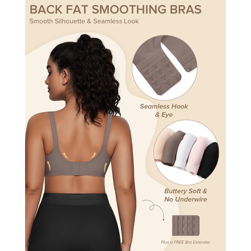 - Updated Design: With our front-adjustable shoulder straps, you can make precise adjustments in seconds—no need to take your bra off! The back smoothing bras for women have 4 rows of hook-and-eye closures and come with a FREE bra extender for a better fit. If your weight fluctuates, it's a great wirefree bra that adjusts to your breast changes