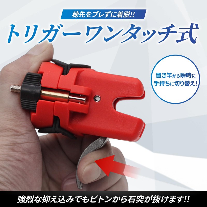 - Easy to put on and take off with one touch trigger. Instantly switches from a standing rod to a handheld