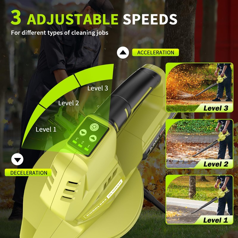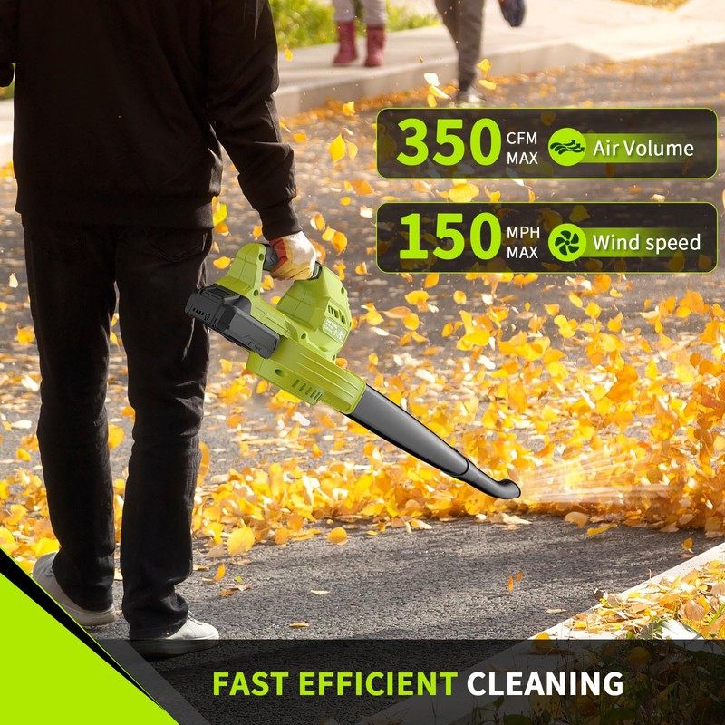 - 3 Speed Mode: The battery leaf blower provides 3 speed adjustments, max air volume up to 350 CFM, and air speed up to 150 MPH; You can choose the appropriate gear according to different cleaning needs (Note: This blower is suitable for cleaning small to medium-sized yards, patios, and driveways, and it's not suitable for large jobs. For heavier works, we recommended to use a more powerful blower)