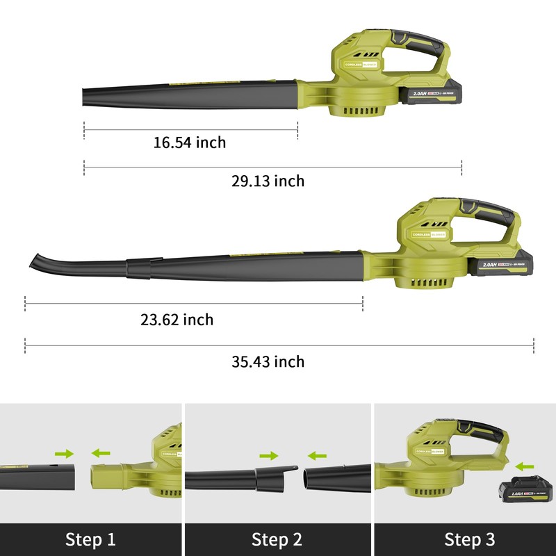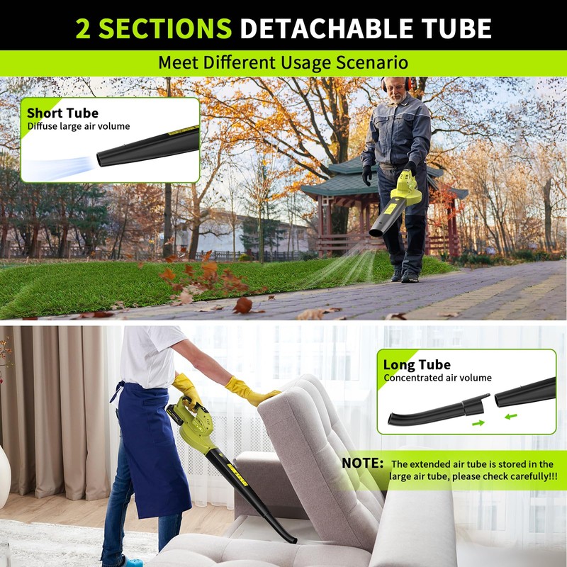 - Easy to Assemble & Lightweight: Adopt a two-section snap-on air tube, you can quickly assemble this cordless leaf blower in just one minute; Short tube expand the blowing area, and long tube concentrate the air volume and increase the wind speed, which can be suitable for different working scenarios; Weighing only 3.1 lbs, easy to operate with one hand (NOTE: The extended air tube is stored in the large air tube, please check carefully!!!)