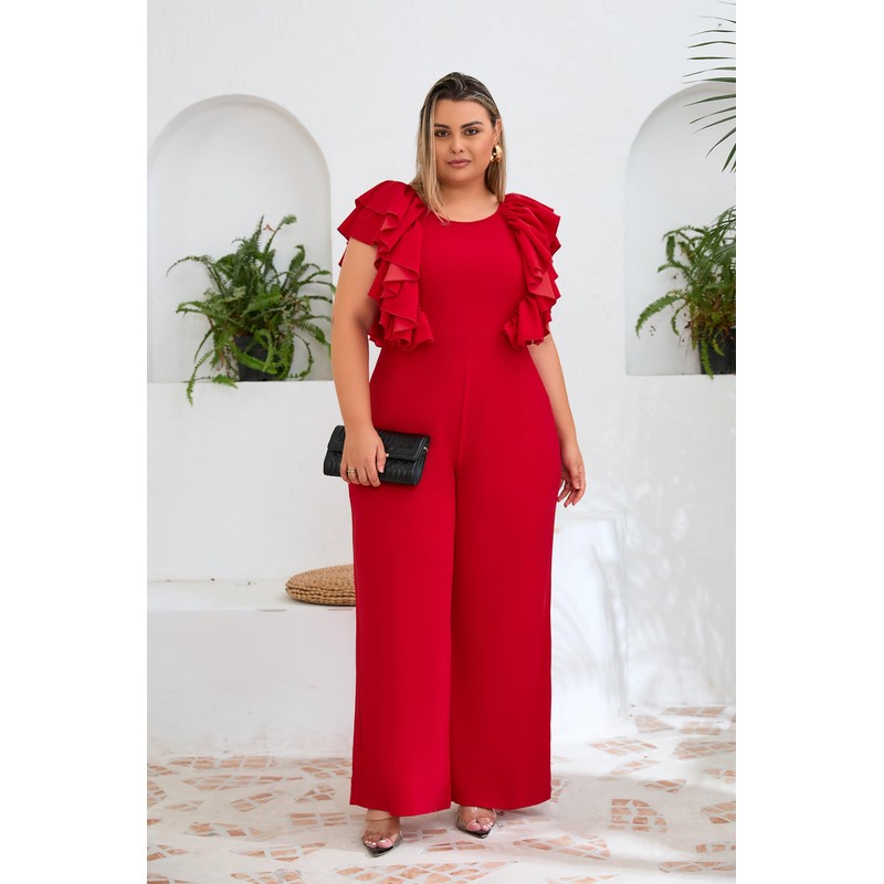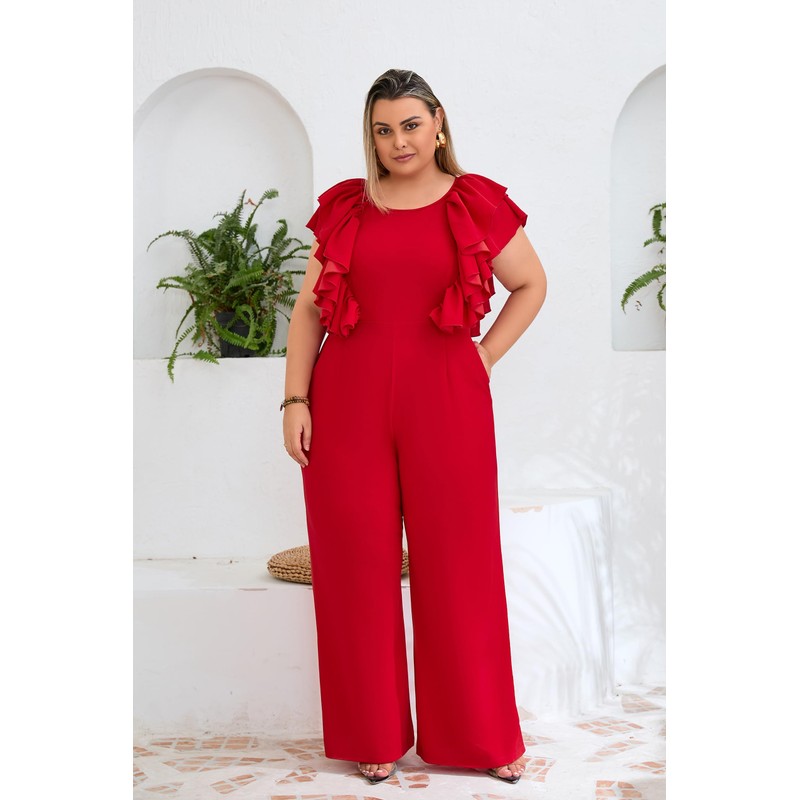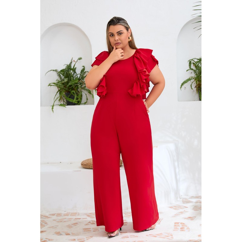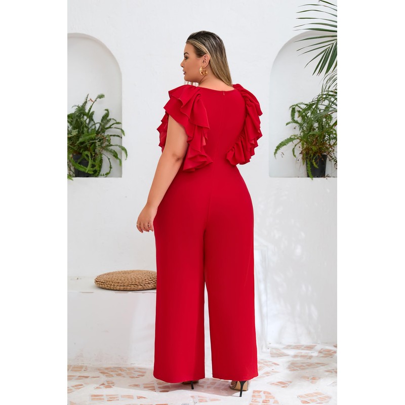 VERWIN Plus Size Ruffle Women's Jumpsuit Plain Full Length Romper Sleeveless Patchwork Overlay Jumpsuit with Pockets XL Red