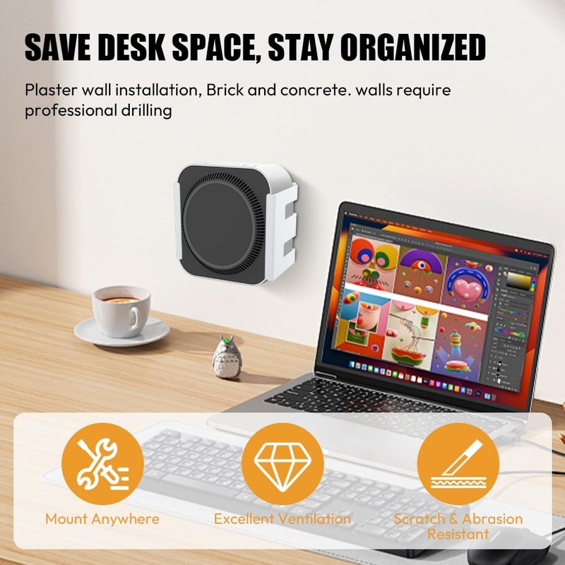 Stable and compatible: Specially designed for Mac mini M4 and M4 Pro, this mount supports the standard VESA distances of 75 x 75 mm and 100 x 100 mm. Ideal for flexible fixings - be it on the wall, under the table or behind the screen. Create more free space and keep your workspace tidy.